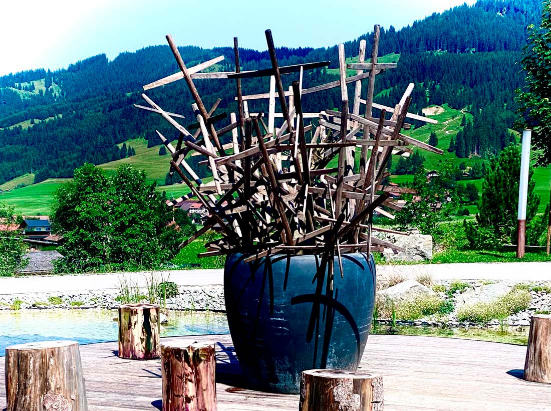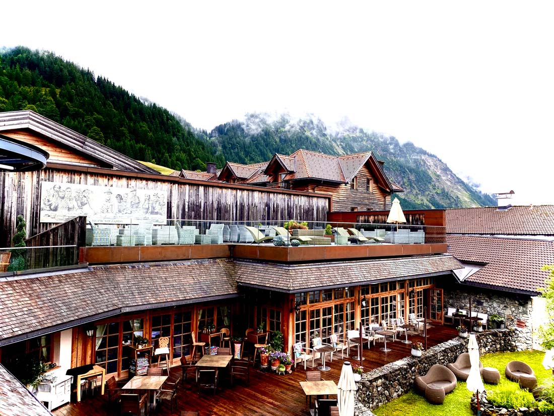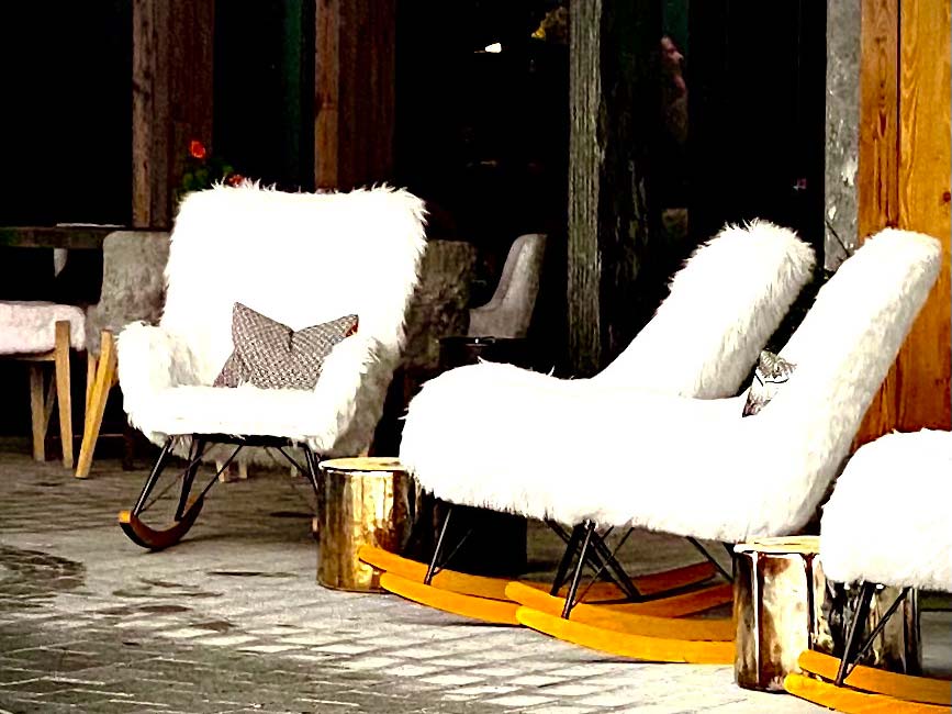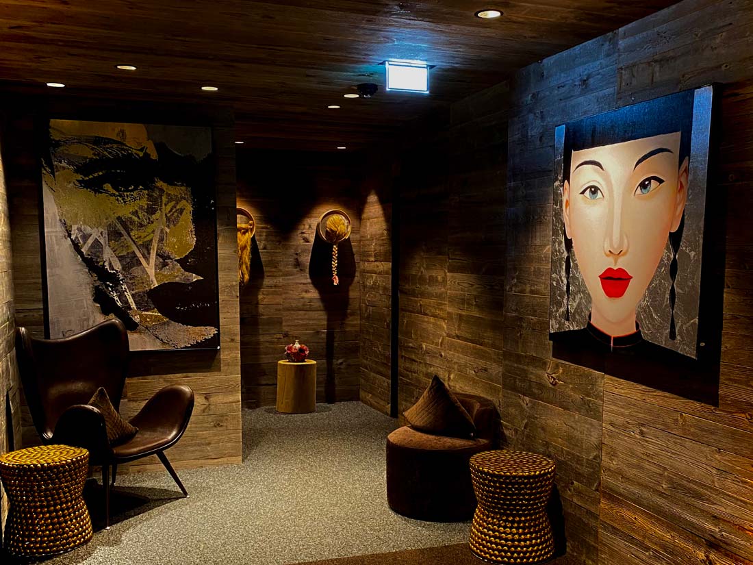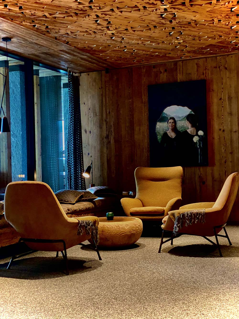 Wenn man sich umschaut ist man hier schon begeistert von der aussergewöhnlich geschmackvollen Einrichtung. Natürlich spiegelt alles die Umgebung, die verwendeten Materialien und auch die Anmutung und Farbgebung verweisen auf die Natur Tirols, was sofort eine Gemütlichkeit ausstrahlt. Überdies ist jedes Detail sorgsam arrangiert und hier trifft gehobener Alpenchic auf sehr viel Gespür für Kunst und Design. Auf unseren weiteren Erkundungen durch das Hotel finden wir viele liebevoll ausgewählte Einzelstücke, trotzdem ist alles wie aus einem Guss.