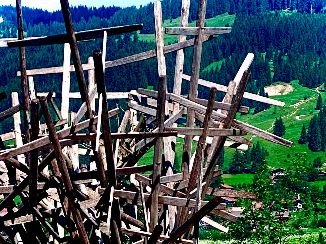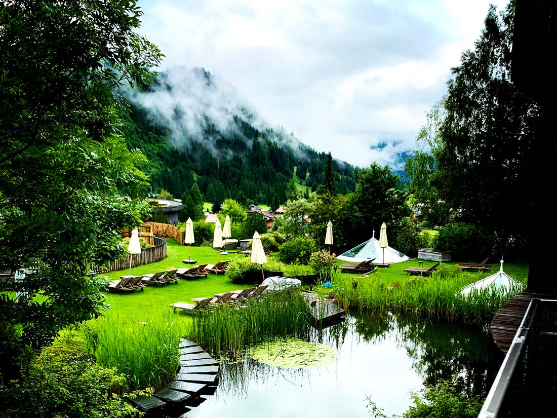 Die Anfahrt war leider etwas regnerisch und es war auch kühl obwohl wir im Juli unterwegs waren. Angekommen in Tannheim geht es irgendwann auf einen kleinen Weg, der eher anmutet wie die Zufahrt zu landwirtschaftlichen Höfen. Nach einigen Biegungen sieht man rechter Hand ein tolles Holzgebäude und vermutet, man ist angekommen. Aber weit gefehlt, hier wohnen die MitarbeiterInnen des Hotels.. also noch ein Stück weiter über eine kleine Brücke, geflankt von 2 Wänden aus riesigen Naturholz Balken mit eingelassenen Milchglas-Elementen. Dahinter steht das Hotel Jungbrunn, eingeschmiegt in die Landschaft, verschachtelt, ohne dass man auch nur im Ansatz die Grösse der Anlage hätte erahnen können.